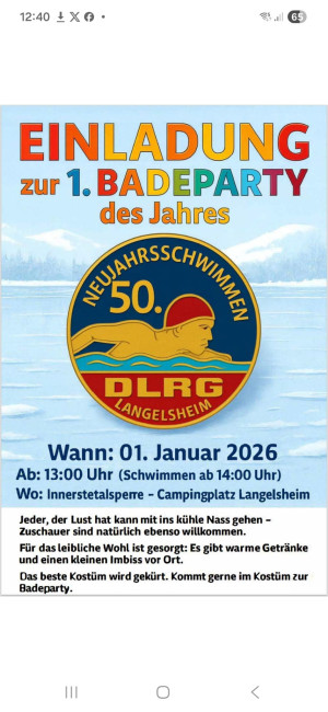 Am 01. Januar 2026 findet das 50. Neujahrsschwimmen an der Innerstetalsperre (Campingplatz Innerstetalsperre 2) statt. Jeder, der sich körperlich in der Lage sieht, kann mit uns um 14 Uhr ins kühle Nass gehen. Ab 13 Uhr gibt es warme Getränke, Würstchen, Kuchen und Waffeln.